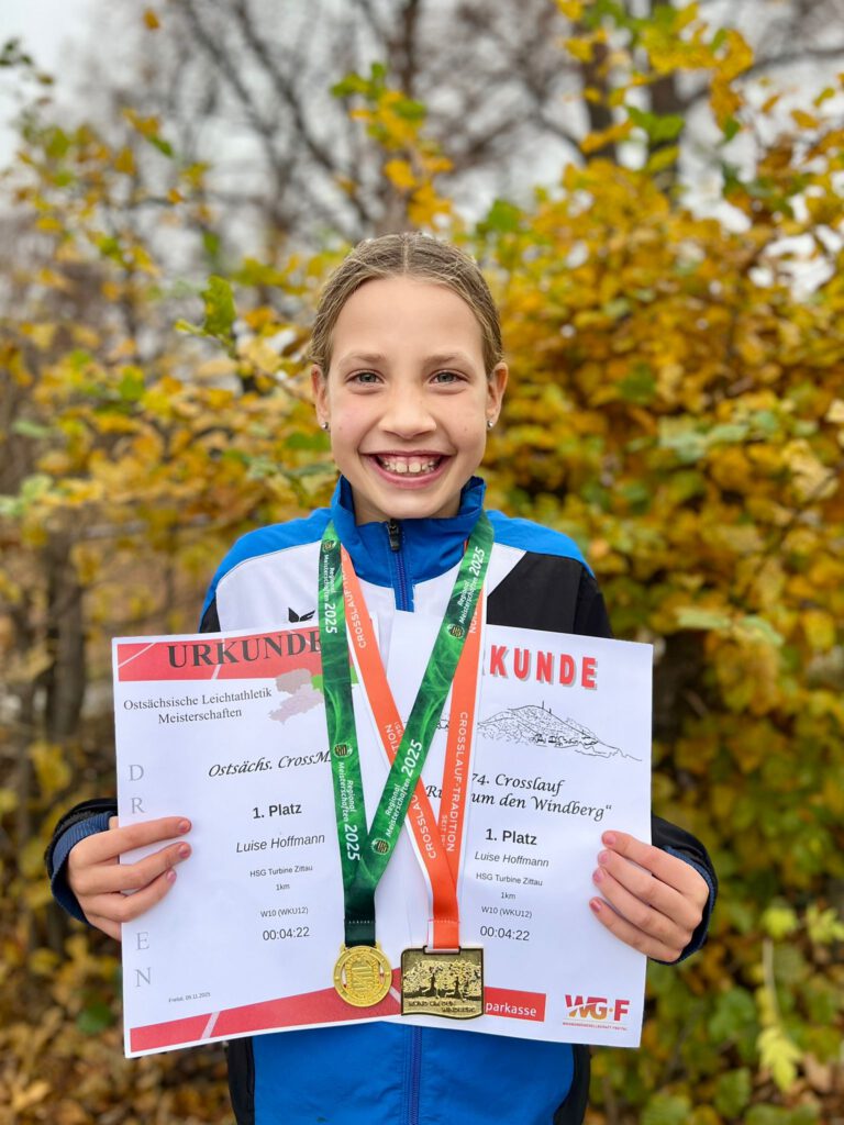 Im Rahmen des Windberglaufes in Freital fand die Ostsächsische Meisterschaft im Crosslauf der AK 10 bis 15 statt. Mit einem tollen Lauf über die schwierige Crossstrecke von 1km gewann Luise Hoffmann in der W10 den Titel. Dazu herzlichen Glückwunsch. Auch Ole Neumann absolvierte den Lauf sehr gut und konnte den sechsten Platz erringen.